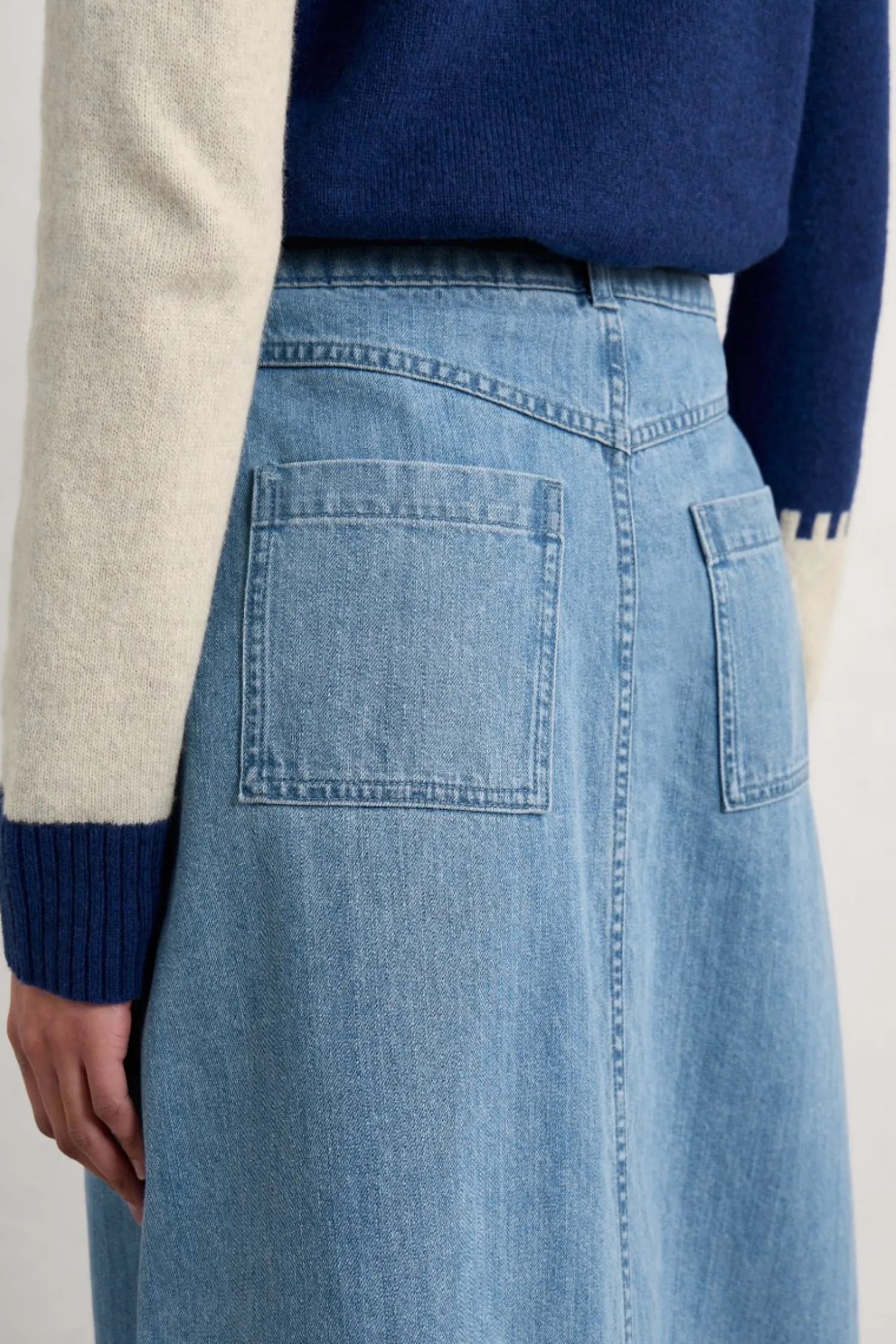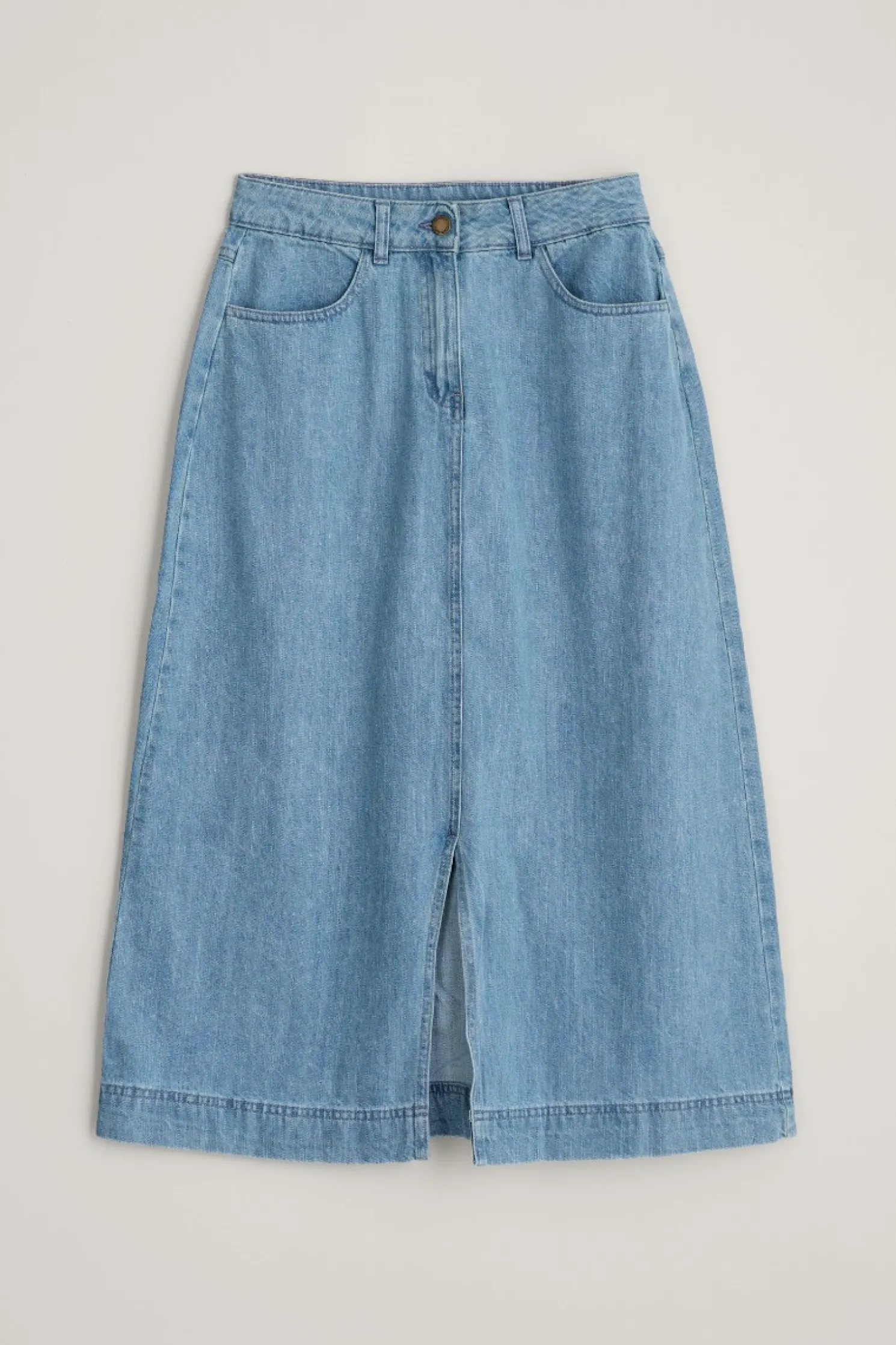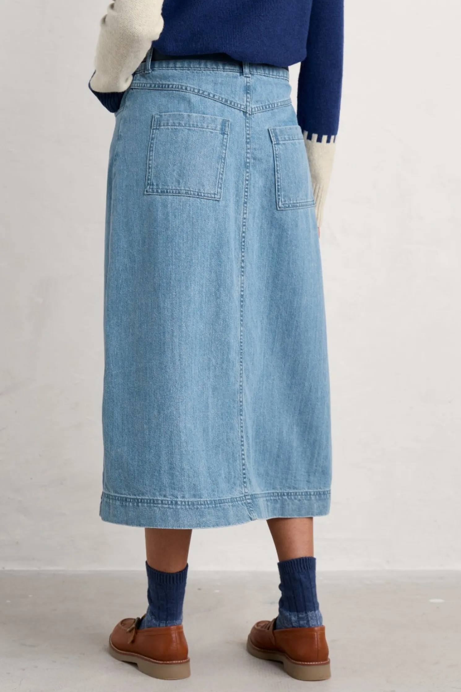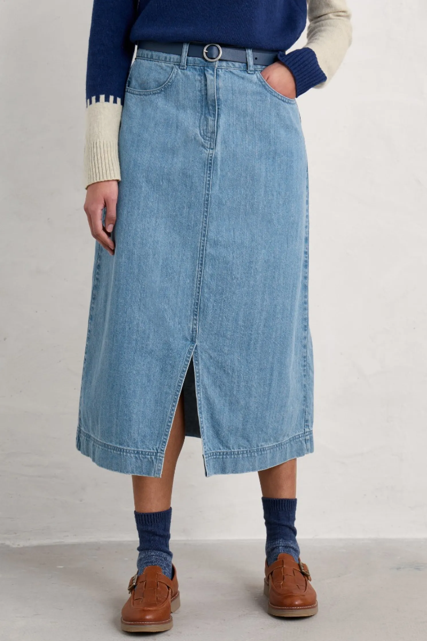 A Timeless, Versatile A-Line Denim Midi Skirt Made From Organic Cotton With A Touch Of Stretch, And A Front Split, For Comfort And Easy Movement. It’s Sure To Become A Wardrobe Staple From Season To Season.