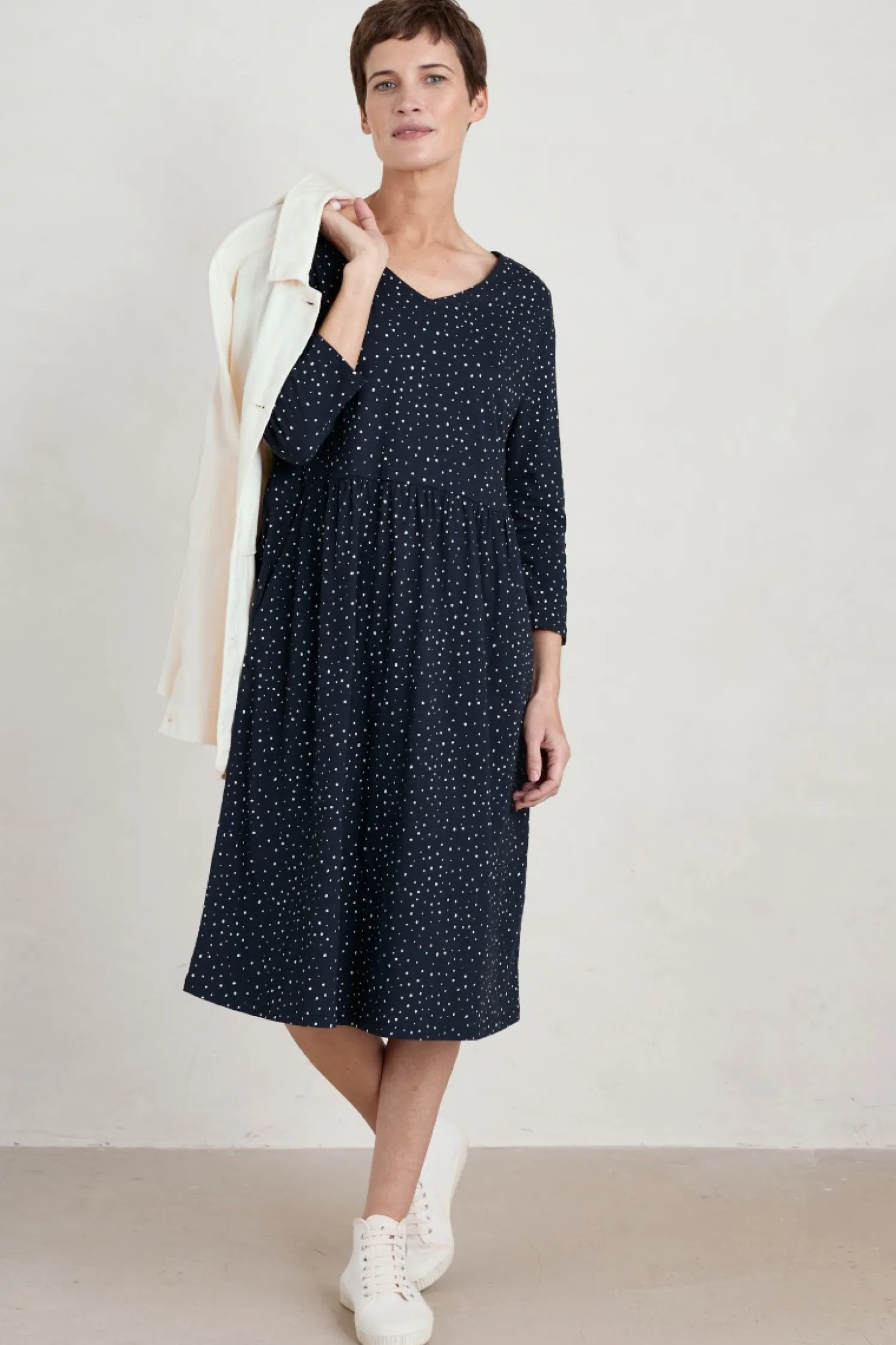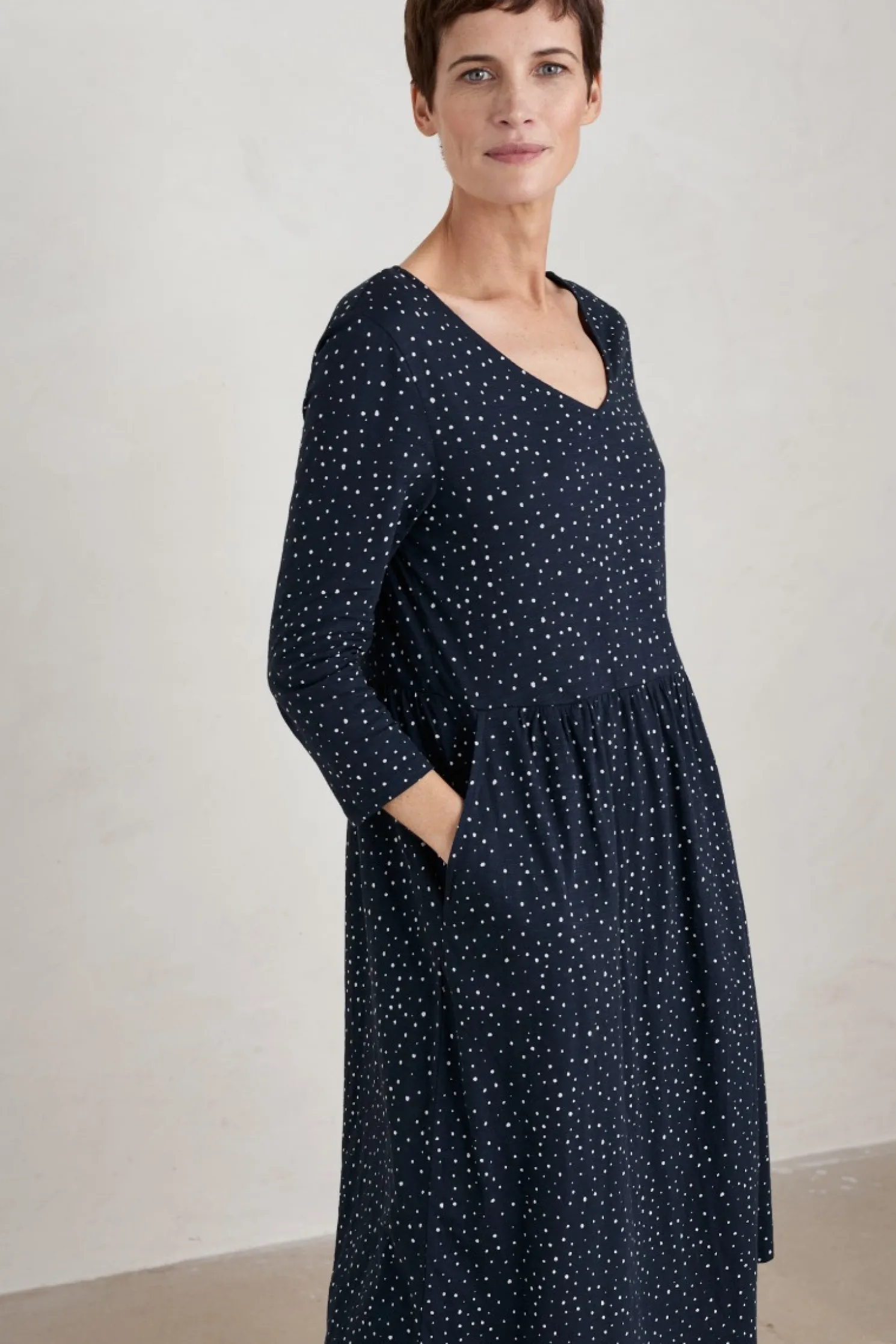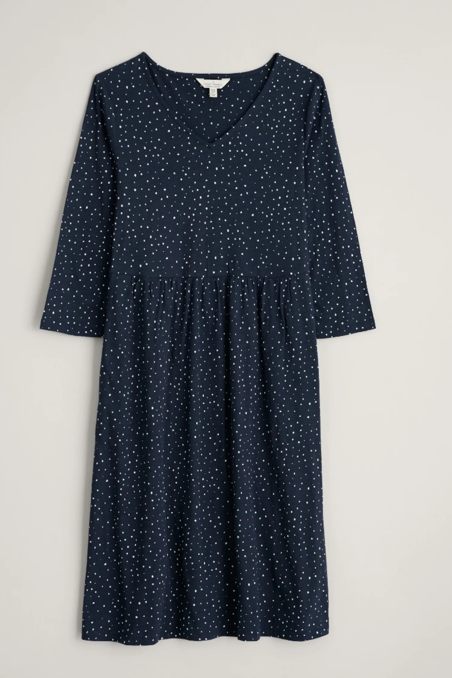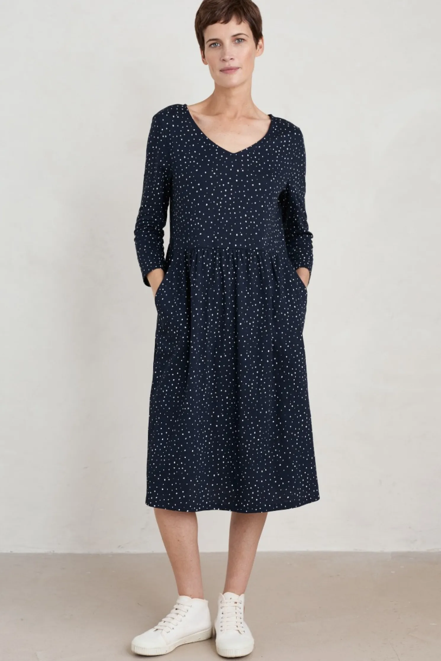 An Effortless Dress In Soft Organic Cotton Jersey, With A V Neck And Softly Gathered Skirt. The Skimming Fit Is Comfortable And Drapey, Perfect With Boots For Winter Walks Or Smart Shoes For Festive Celebrations.