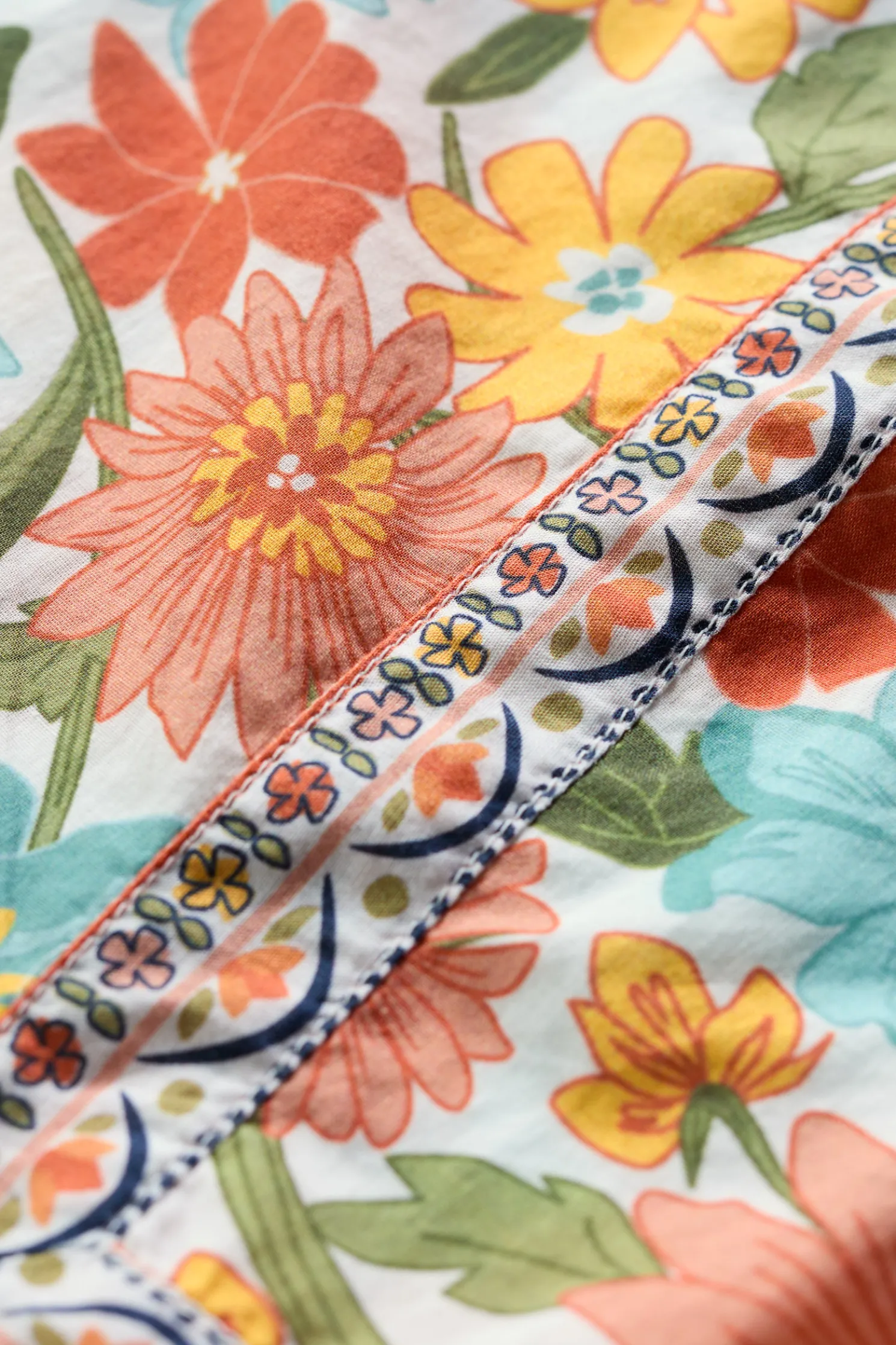 A Vintage-Inspired Button Through V-Neck Tunic With An A-Line Shape That Has Subtle Gathers At The Waist For A Gentle, Skimming Volume. Ribbon Trim With A Sweet Contrast Pattern Creates A Feature Of The Side Panels, And Is Echoed At The Button Cuffs.
