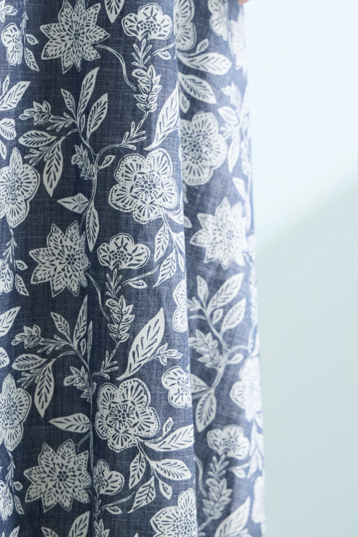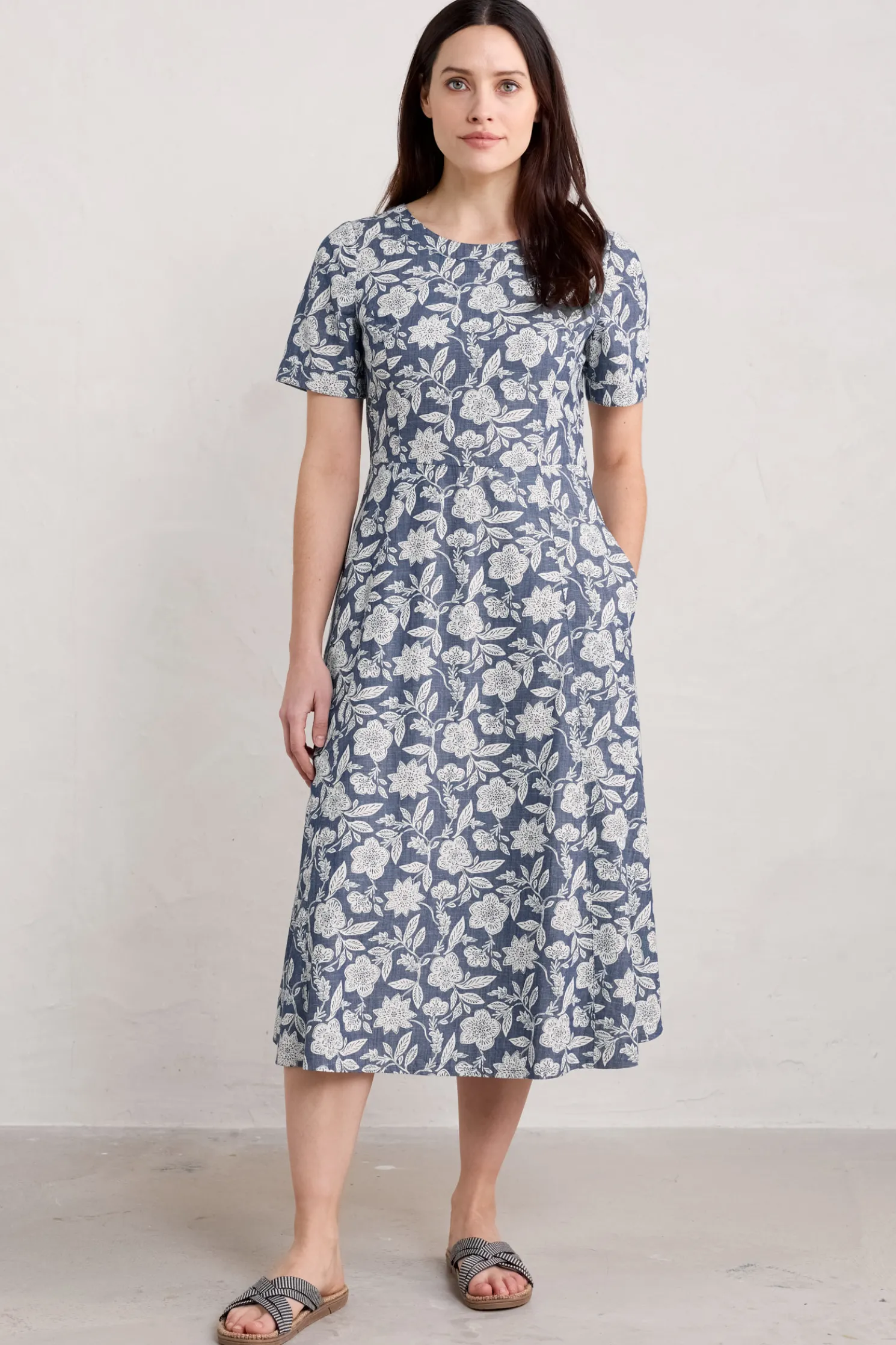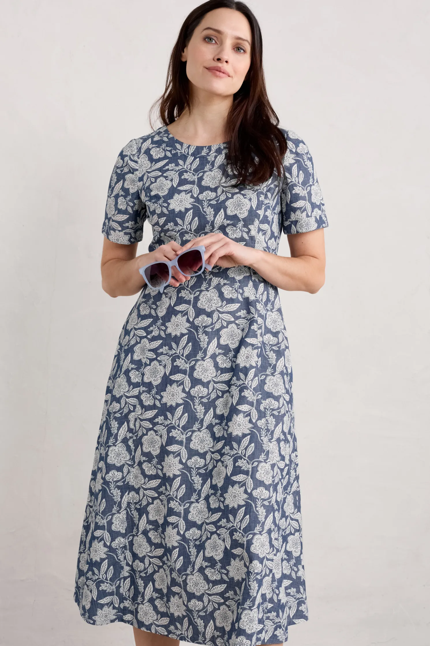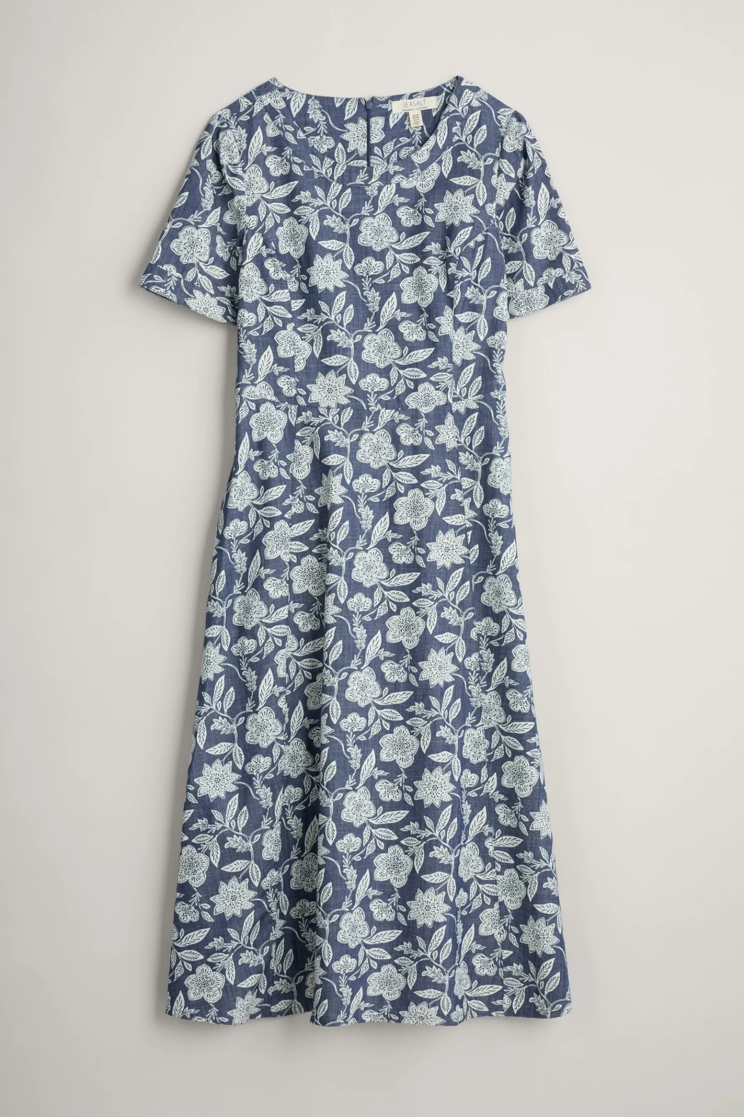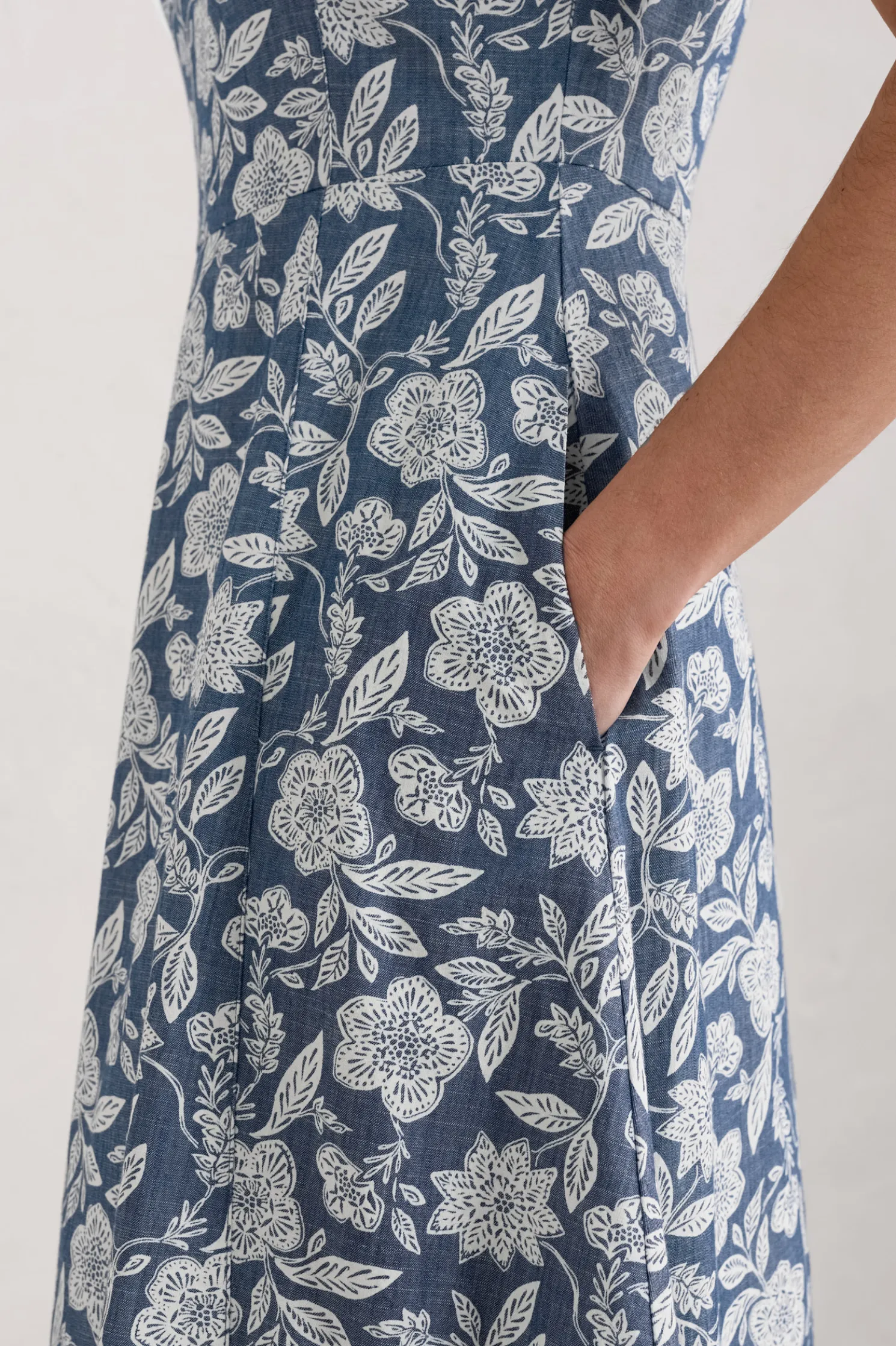 Printed Midi Dress Made From Printed Organic Cotton Chambray, With A Classic Waisted Shape And In-Seam Pockets. A Versatile Style That Can Be Worn To Work, At The Weekend, Or To Special Summer Occasions.