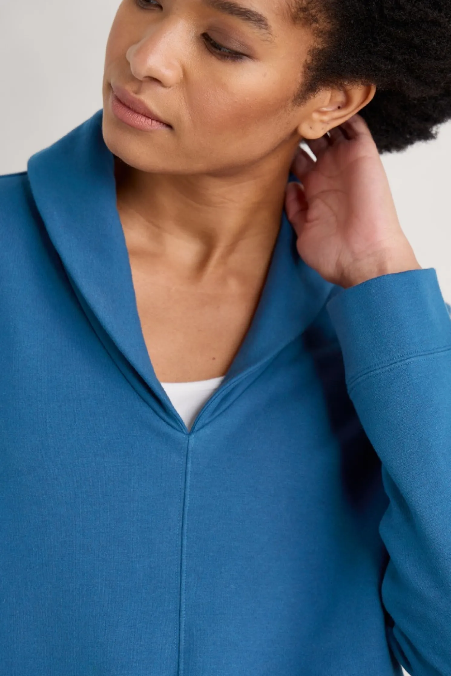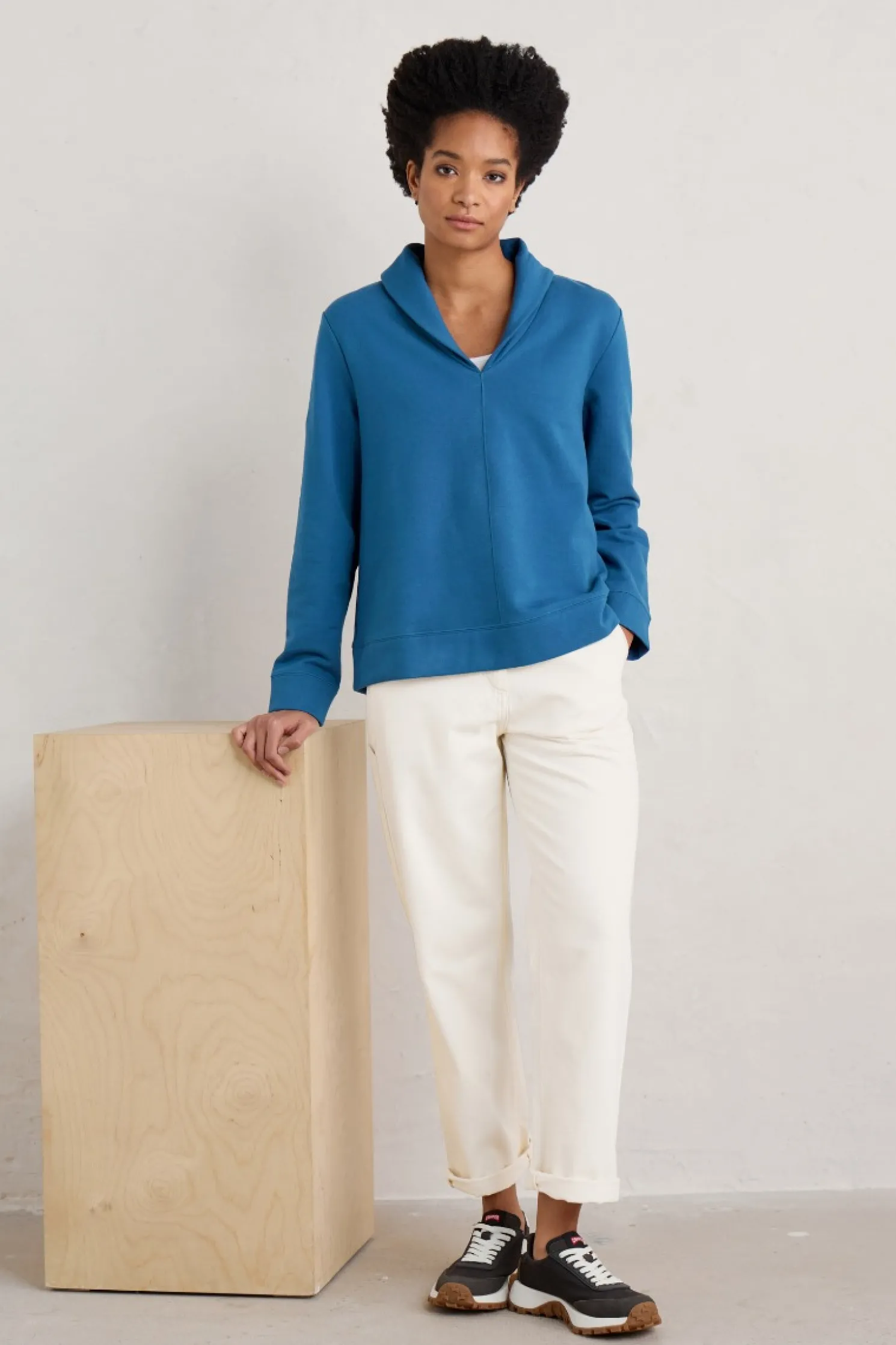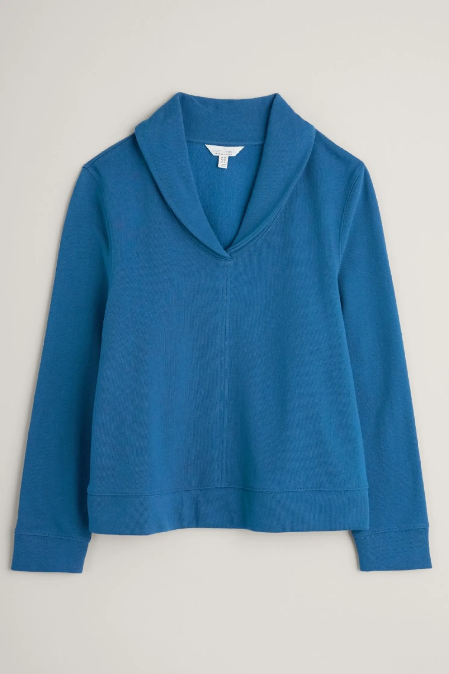 A Simple Sweatshirt With A Cosy Shawl Collar, Made From Soft Organic Cotton Brushback Jersey. The Top Stitch Patterns And Deep Cuffs And Hem Give It An Elevated Twist. Perfect For Stylish Warmth On Chilly Days.