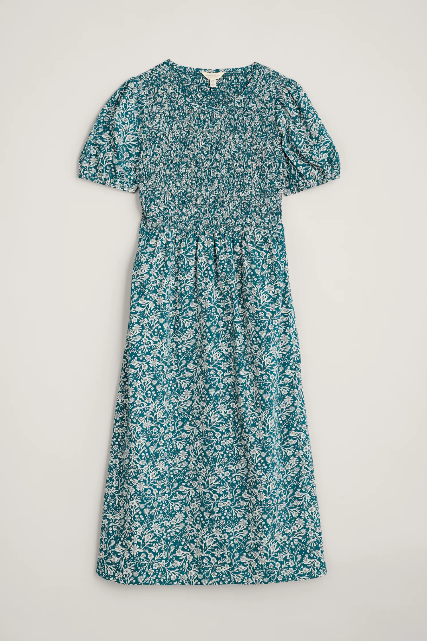 A Versatile Summer Dress That Blends Elegance And Ease, With A Smocked Bodice And Full, Above-The-Ankle Skirt. The Short Sleeves Have An Elasticated Cuff Which Gives Them A Subtle Volume.