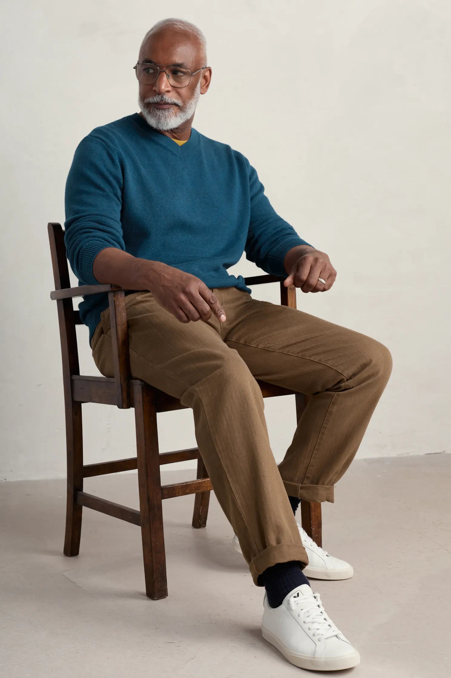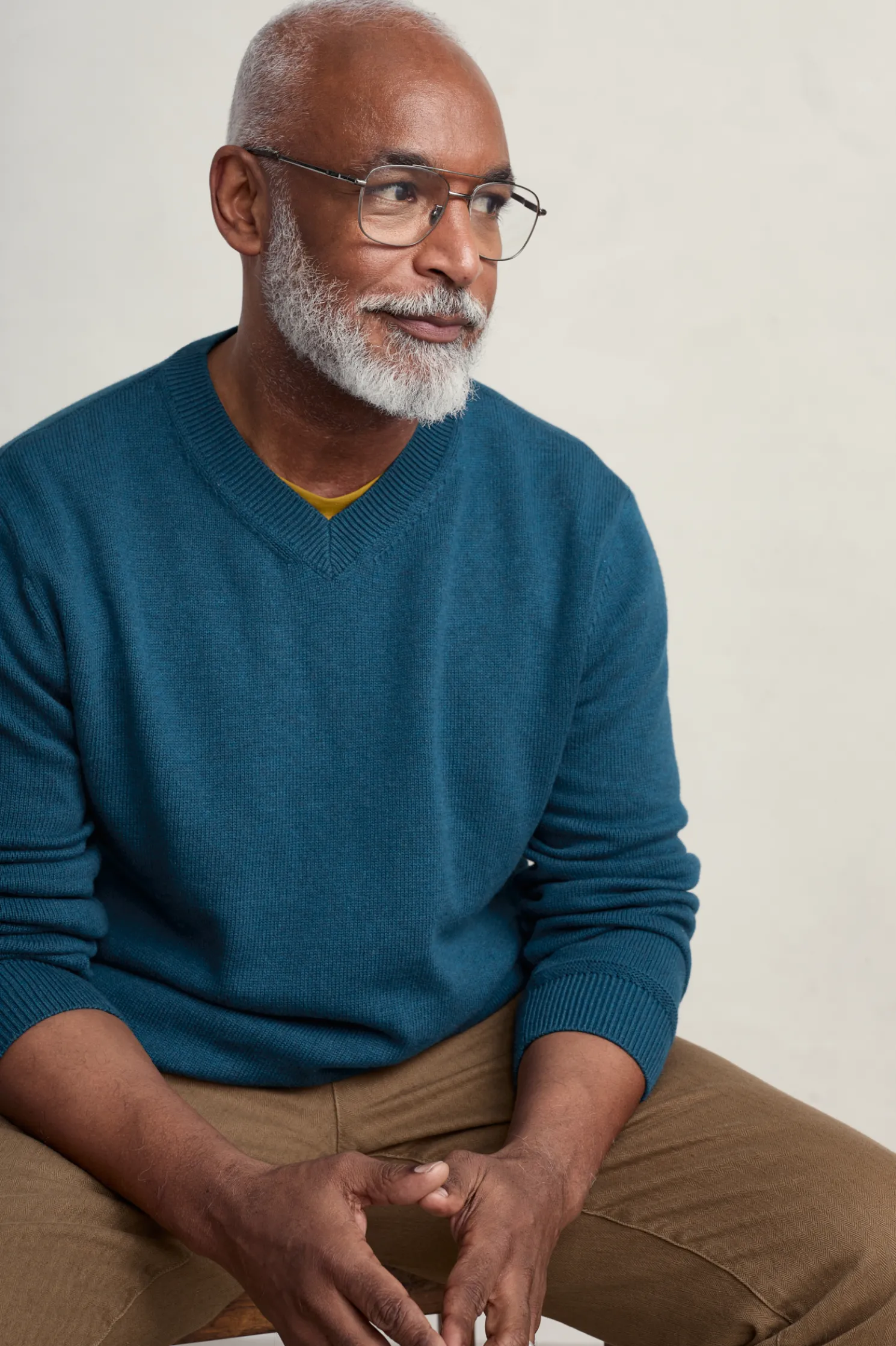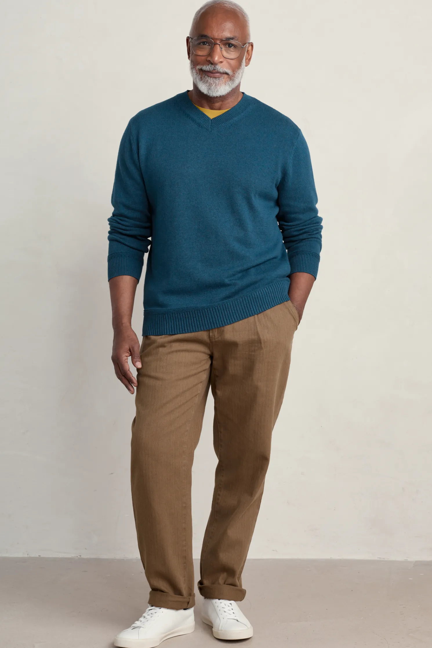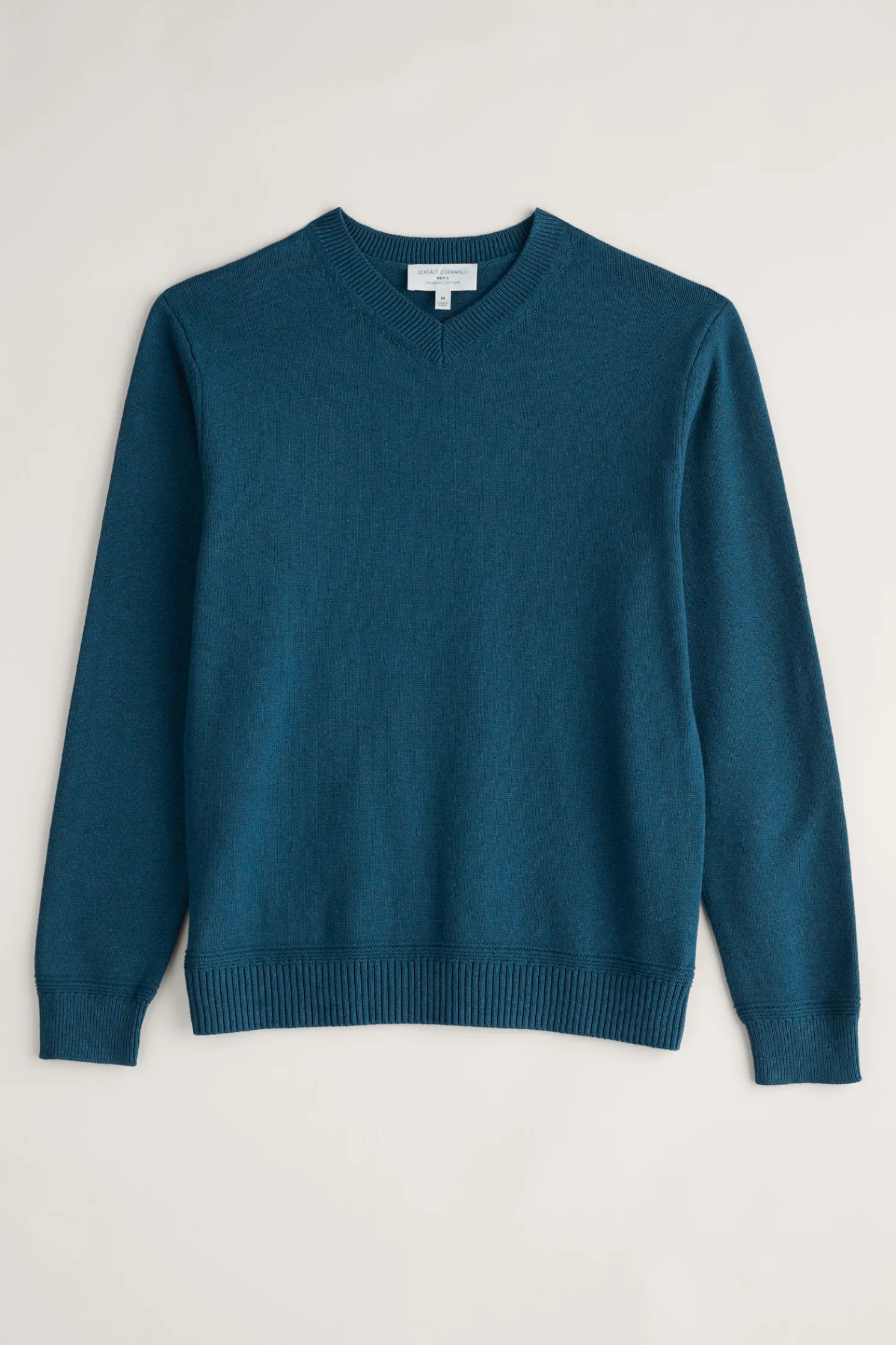 A Lightweight But Warm Jumper, Knitted With A 7 Gauge Jersey Stitch From Organic Cotton Yarn. The V-Neck Looks Good Over Collared Shirts Or Simple T-Shirts, And The Ribbed Cuffs And Hem Give It An Easy Shape.