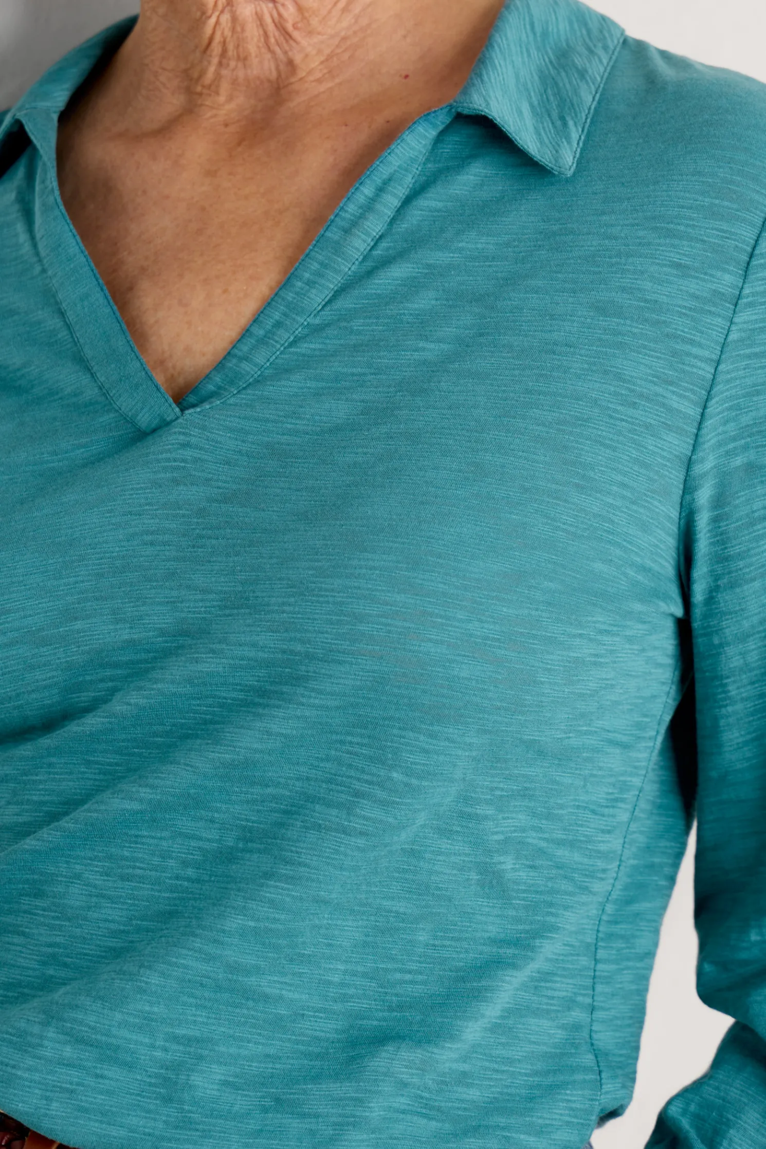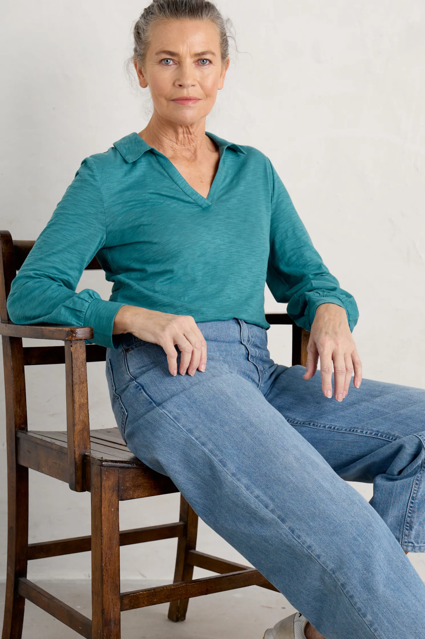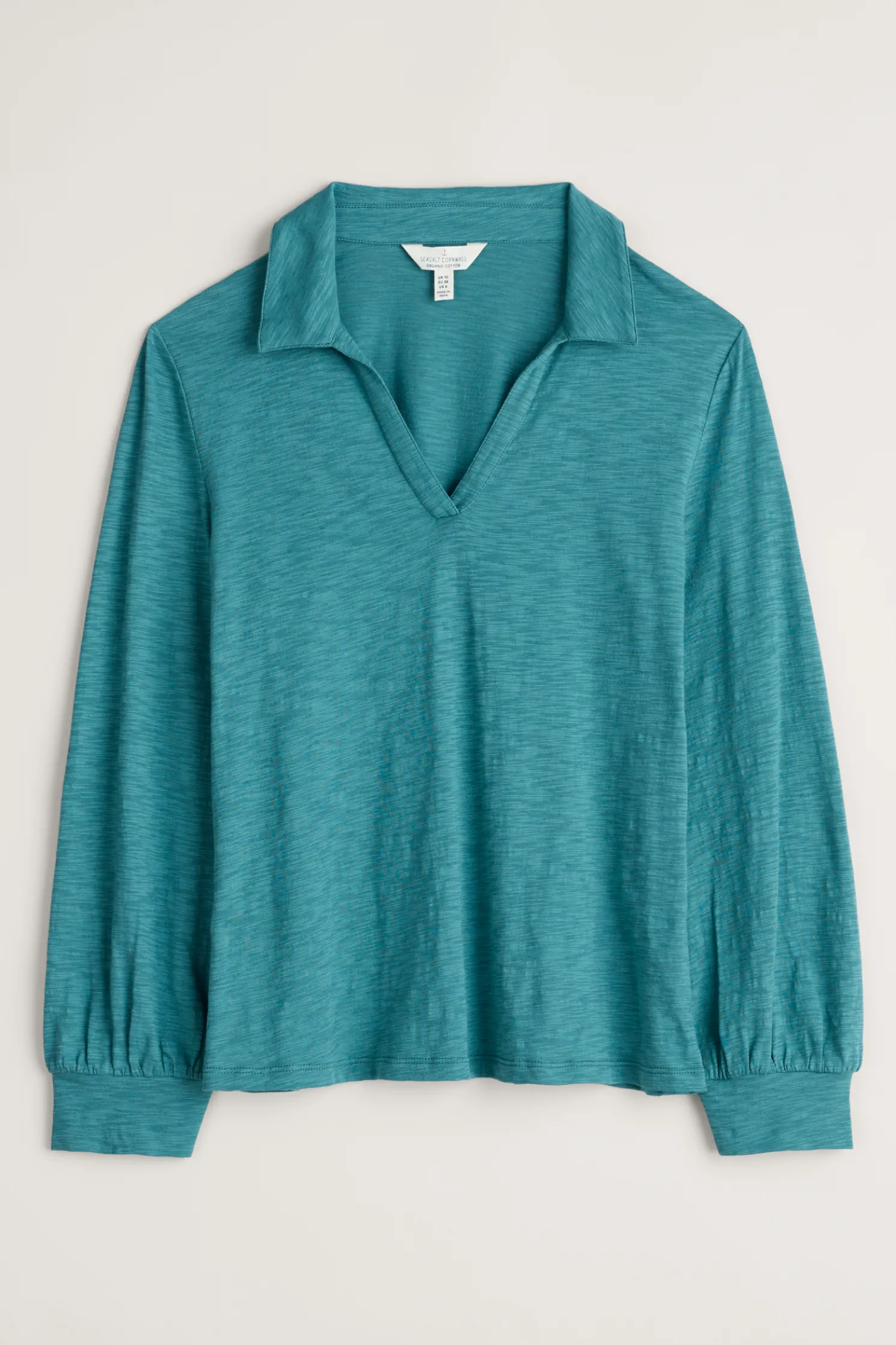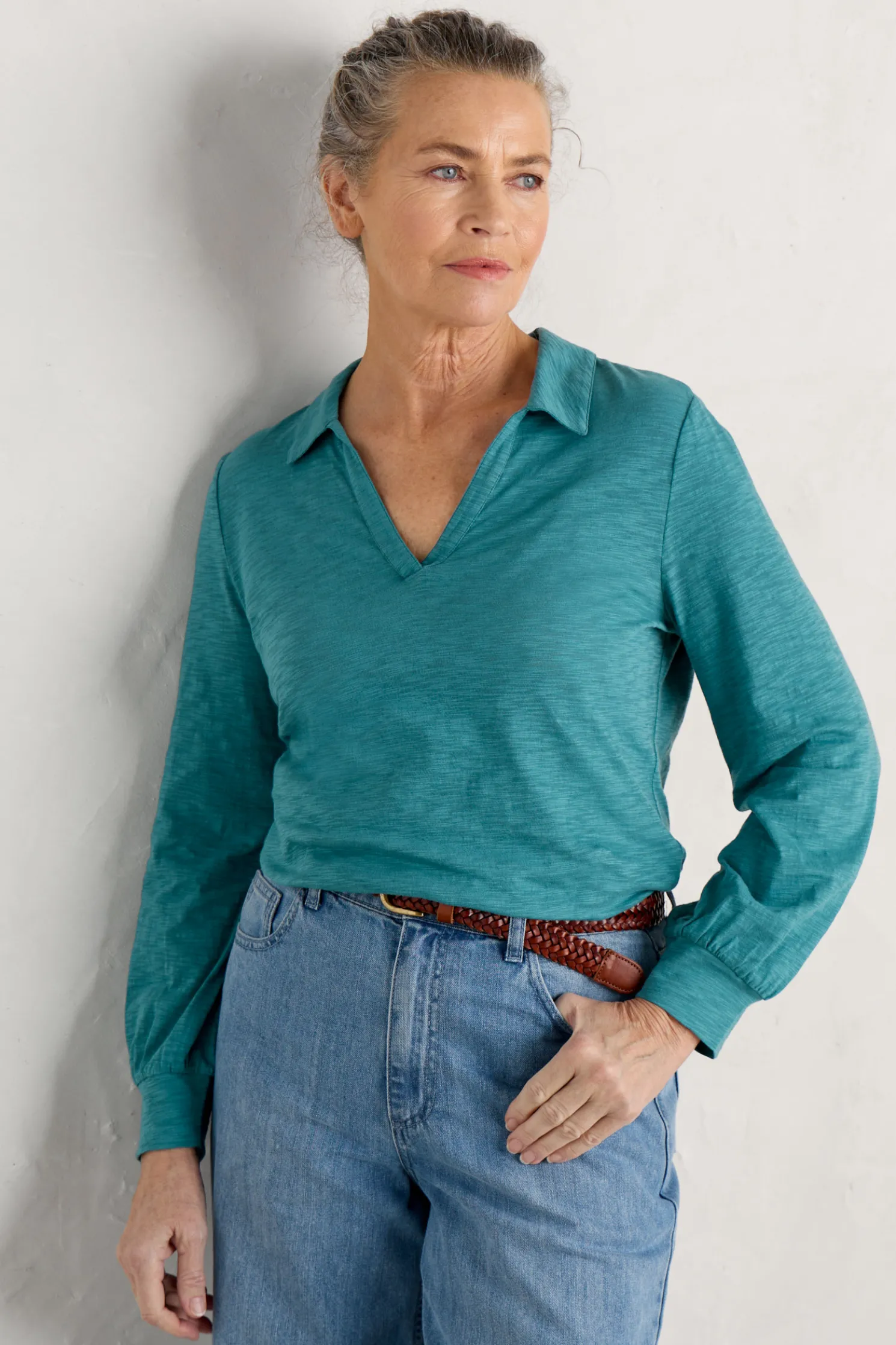 A Collared Shirt Made From Soft Organic Cotton Jersey, With Romantic Blouson Sleeves And A Deep V-Neck. A Versatile And Breathable Piece That We Love Layered Under Pinafores, Tucked Into Skirts And Worn Loose Over Trousers.