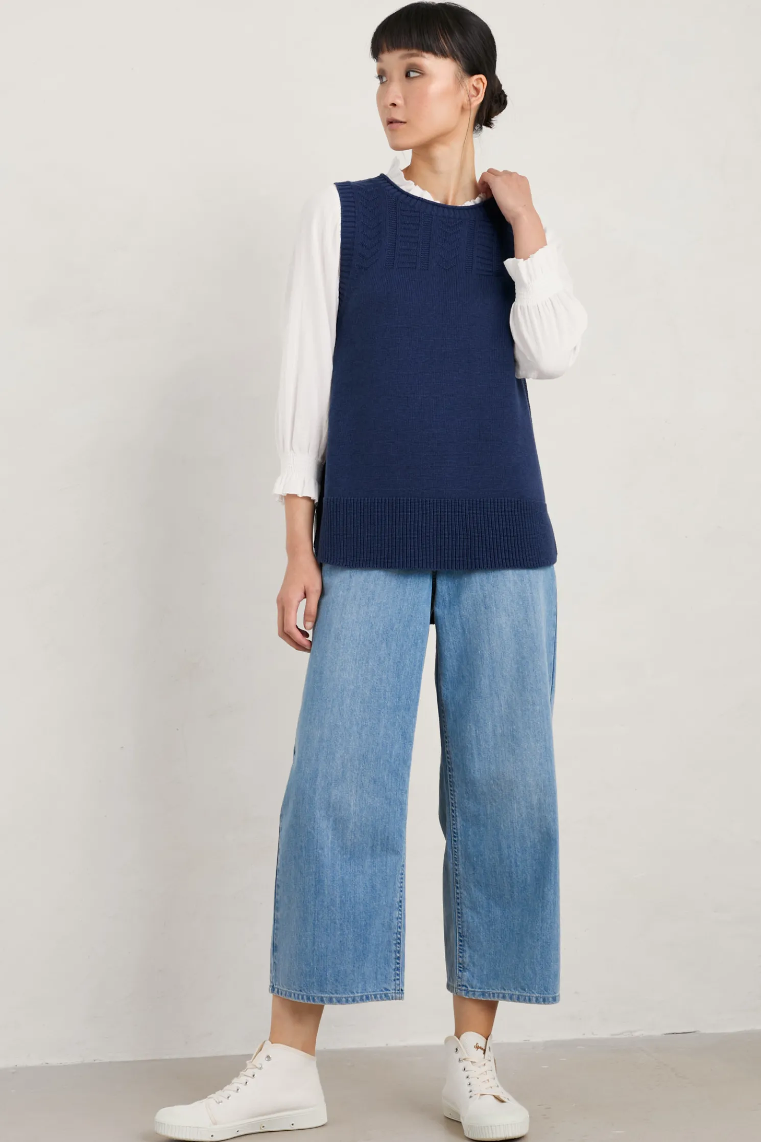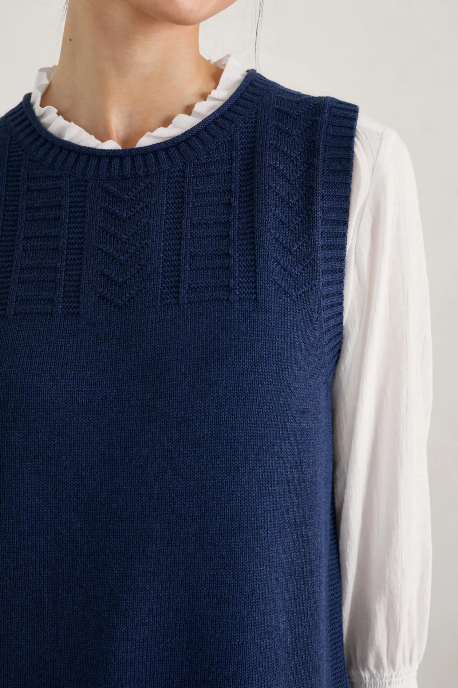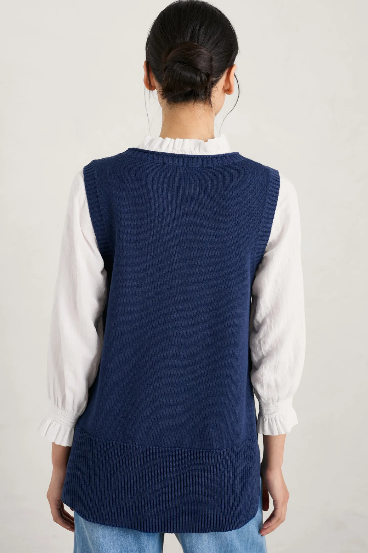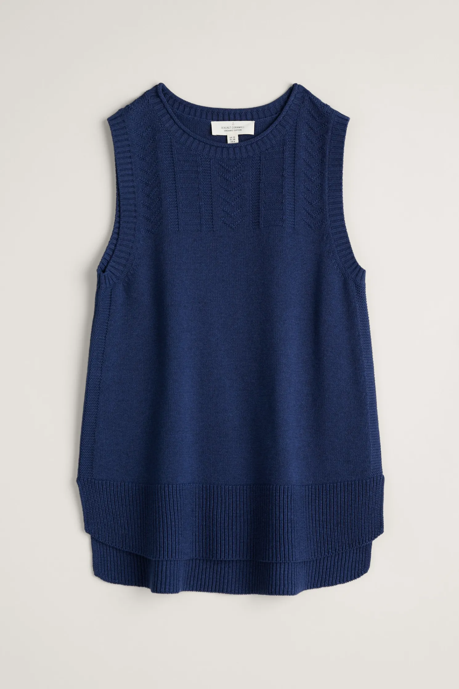 One Of Our Longer Knitted Vests, Made From Breathable Organic Cotton With An Easy Shape And A Split Stepped Hem That Make It Perfect For Layering. The Stitch Patterning At The Yoke Is Inspired By Traditional Fisherman’s Jumpers.